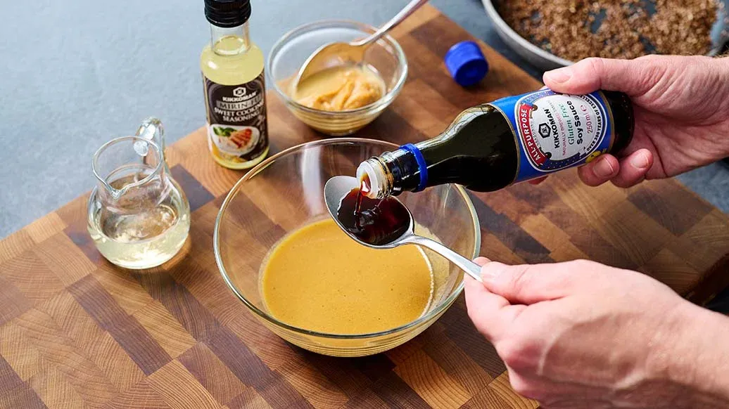 1 ч. л. мисо-пасты – 2 ст. л. яблочного уксуса – 2 ч. л. льняного масла – 2 ч. л. безглютенового соевого соуса Tamari Kikkoman – 1 ч. л. сладкой мирин приправы Kikkoman – Свежемолотый перец – 2 ч. л. семян льна (по желанию измельченных) – 2 ст. л. воды