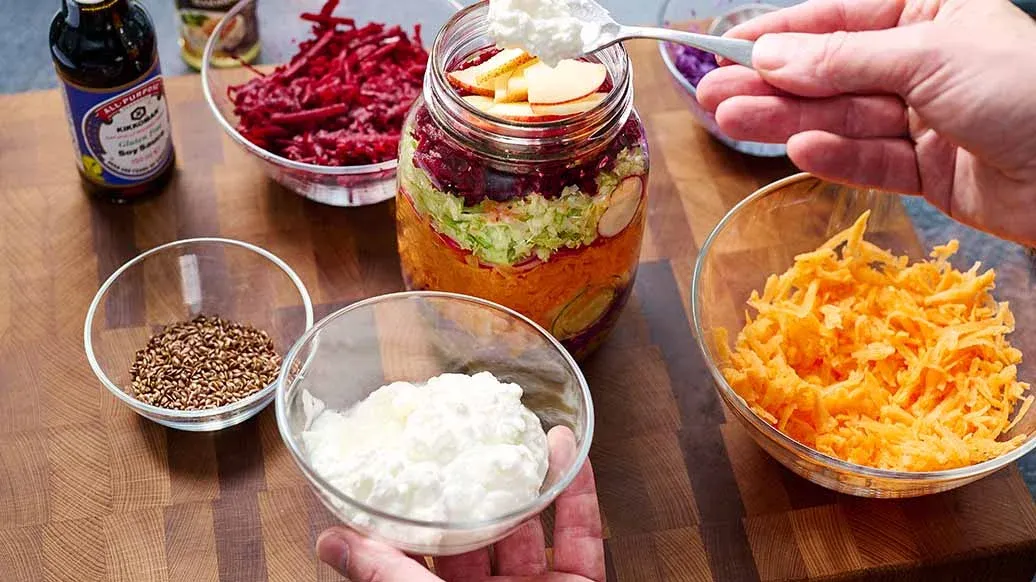 Выложите салат в высокую стеклянную банку в следующем порядке: заправка, красная капуста, яблоко, морковь, редис, остроконечная капуста, свекла, груша, сливочный сыр и семена льна. Перед подачей закройте банку крышкой и встряхните, чтобы заправка распределилась равномерно. В качестве альтернативы можно подать салат в мисках.