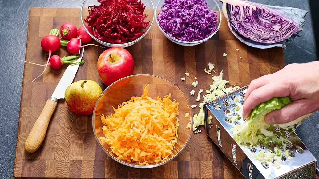 100 г остроконечной капусты – 160 г красной капусты – 120 г свежей свеклы – 2 моркови – 50 г редиса – 1 небольшое яблоко с красной кожурой – 1 небольшая груша с красной кожурой