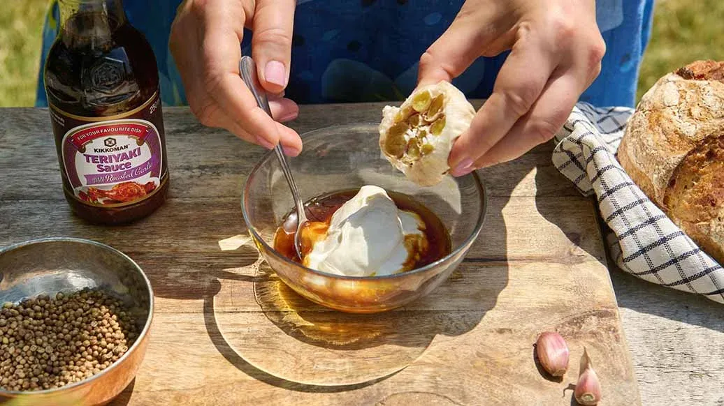 Разогрейте духовку до 200°C. Срежьте верхушку с головки чеснока, смажьте оливковым маслом и посыпьте щепоткой соли. Заверните в фольгу и запекайте в течение 30–40 минут до золотистого цвета и мягкости. После остывания выдавите зубчики и разомните их в пюре. Смешайте чеснок с соусом Терияки Kikkoman и греческим йогуртом.