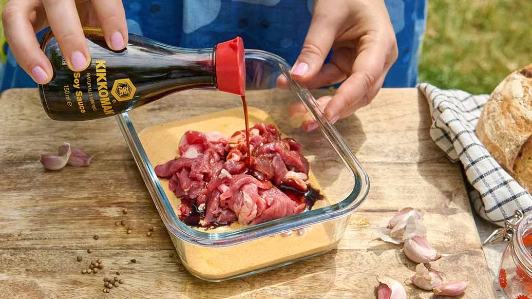 200 г бараньей лопатки, тонко нарезанной – 2 зубчика чеснока, рубленых – 2 ст. л. натурального йогурта – 1 ст. л. лимонного сока – 1 ст. л. оливкового масла – 1 ч. л. молотой зиры – 1 ч. л. молотой паприки – ½ ч. л. молотого кориандра – ½ ч. л. молотой корицы – 4 ст. л. соевого соуса натурального брожения Kikkoman
