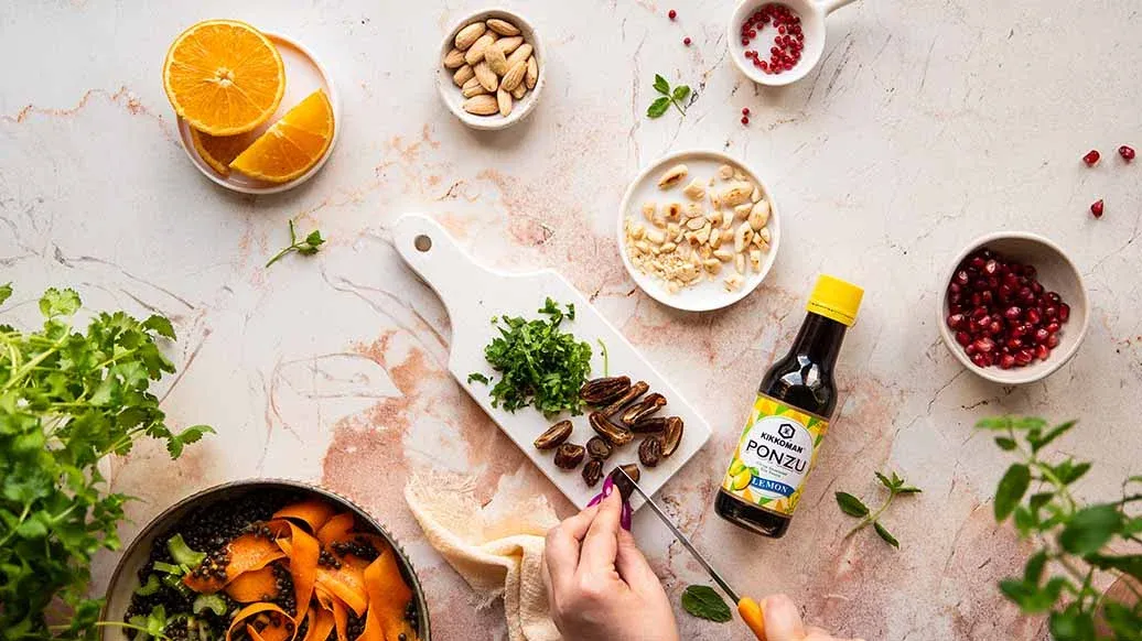Лёгкий, но сытный салат по-мароккански из чёрной чечевицы, хрустящих овощей, сладких фиников и ароматных трав, заправленный цитрусовым соусом с добавлением Понзу Kikkoman Лимон. Идеальная закуска или гарнир, богатый белком, с интересной текстурой и вкусом.
