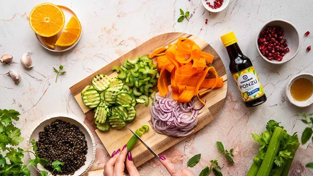 Очистите морковь и нарежьте ее тонкими полосками. Нарежьте огурец и сельдерей слайсами, а лук нарежьте тонкой соломкой. Смешайте овощи с чечевицей. В отдельной миске смешайте оливковое масло с соусом Понзу Kikkoman Лимон, апельсиновым соком и цедрой, кленовым сиропом, чесноком, корицей, тмином и красным перцем, чтобы приготовить заправку.