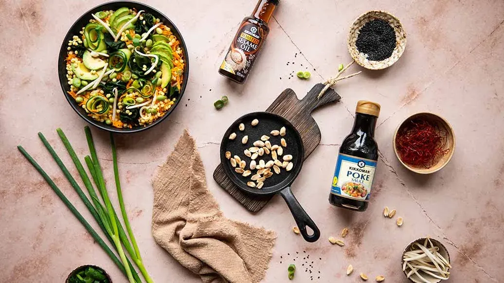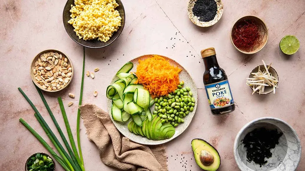 Сочные овощи, кремовое авокадо, эдамаме и нежные водоросли вакаме с кускусом в лёгкой медово-лаймовой заправке, приготовленной с соусом Поке Kikkoman. Арахис, ростки и чёрный кунжут придают этому освежающему салату яркий вкус и дополнительный хруст.