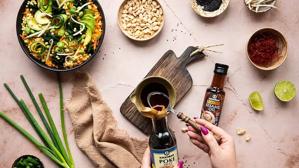 2 ст. л. соуса Поке Kikkoman – ½ ст. л. сока лайма – 1 ст. л. масла Kikkoman из поджаренного кунжута – 1 ч. л. мёда