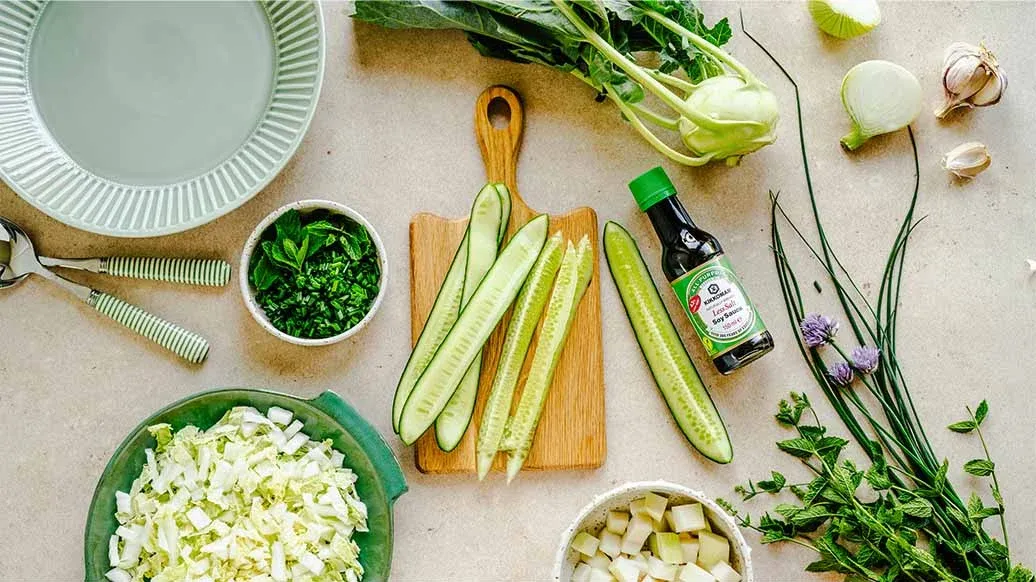 1 кочан пекинской капусты – 1 длинный огурец – 1 кольраби – 1 пучок шнитт-лук – 1 веточка свежей мяты