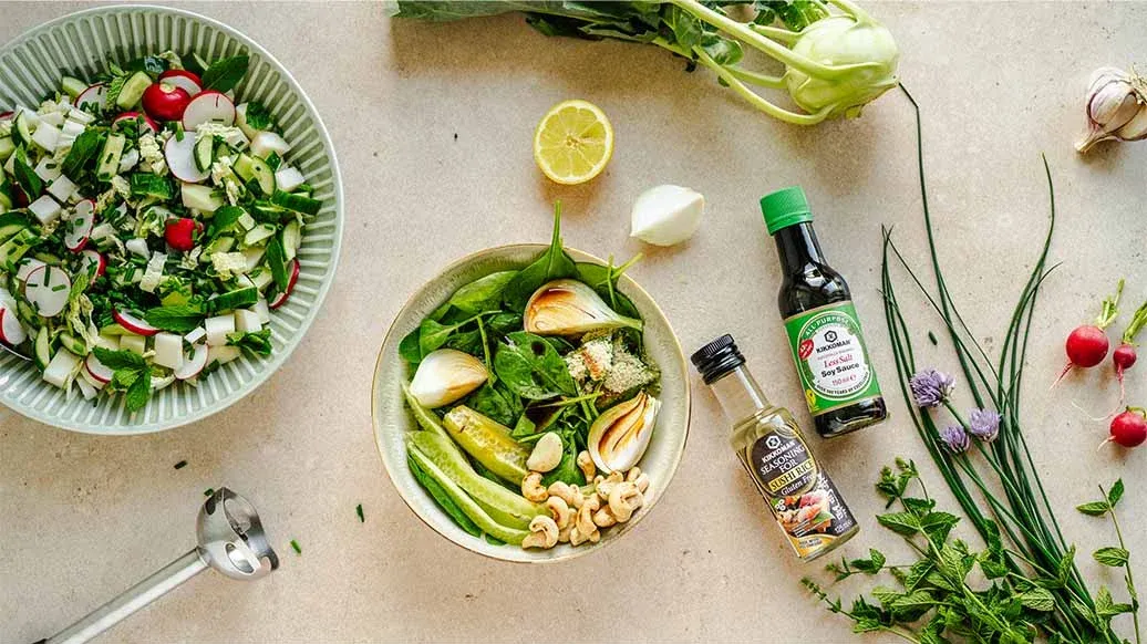 Смешайте шпинат, лук, чеснок и отложенные семена огурца с оливковым маслом, слабосоленым соевым соусом Kikkoman, приправой Kikkoman для суши, лимонным соком, дрожжами и орехами кешью до однородного соуса. Полейте овощи заправкой и тщательно перемешайте.