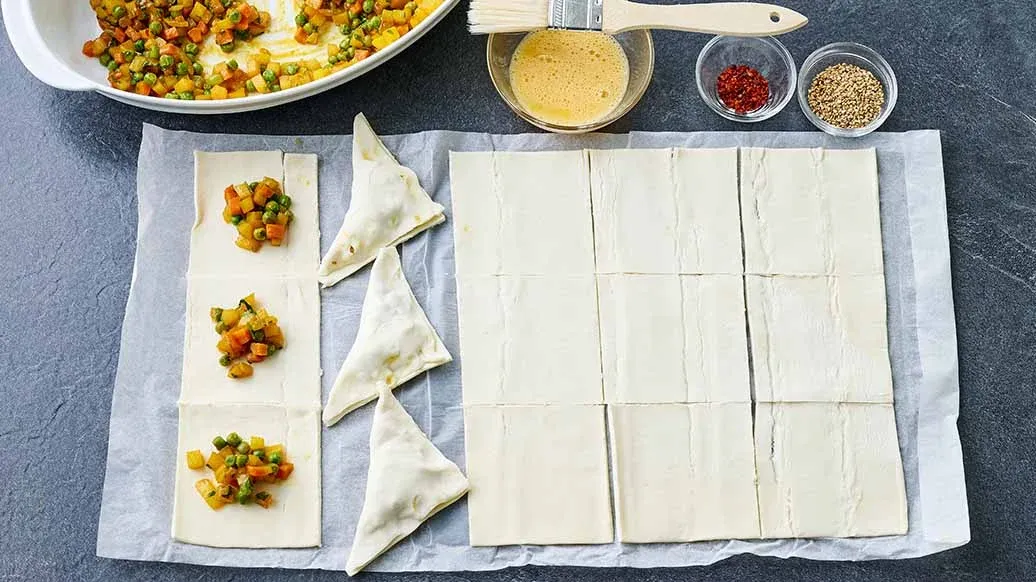 Приготовьте домашнее тесто: замесите 135 г муки, 40 мл растительного масла и щепотку соли с 85 мл воды (или даже меньше) до гладкого теста. Сформируйте шар, заверните в плёнку и охлаждайте около 30 минут. Раскатайте как можно тоньше (около 1 мм), вырежьте нужную форму и следуйте нашему рецепту выше. Обжарьте самосы с начинкой во фритюре.