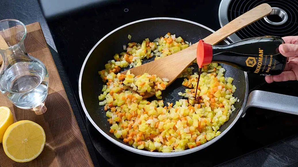 Очистите картофель и морковь, вымойте, мелко нарежьте кубиками вместе с луком и обжарьте в разогретом масле. Добавьте соевый соус Kikkoman, примерно 3 ст. л. воды и лимонный сок и дегласируйте. Тушите без крышки около 10 минут, регулярно помешивая.