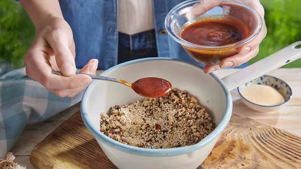 Приготовьте киноа по инструкции на упаковке. Разогрейте масло в сковороде. Добавьте в горячее масло чили соус Кимчи Kikkoman, нарезанный чеснок и кунжут. Отложите в сторону и дайте остыть, затем смешайте с киноа.