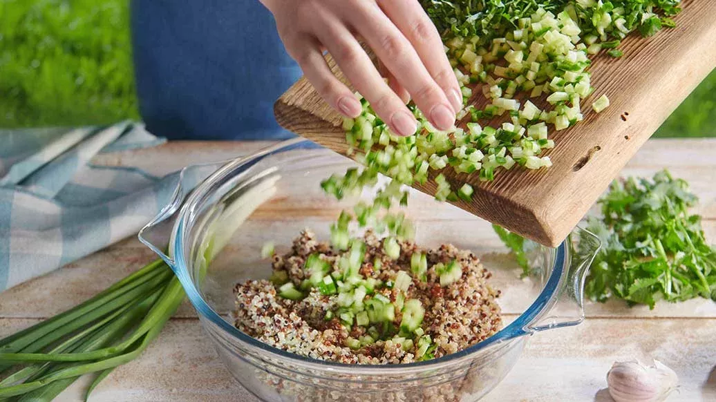 Нарежьте кинзу и зеленый лук. Нарежьте огурец небольшими кубиками. Смешайте киноа из шага 2 с кинзой, зеленым луком, маслом и огурцом. Приправьте солью и перцем.