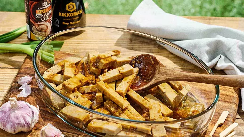 Нарежьте сейтан длинными полосками или кубиками. Смешайте в миске масло, соевый соус Kikkoman, зиру, измельченные чеснок и лук, дрожжевые хлопья, уксус и кунжутное масло. Тщательно смажьте сейтан маринадом и уберите в холодильник минимум на 1 час.