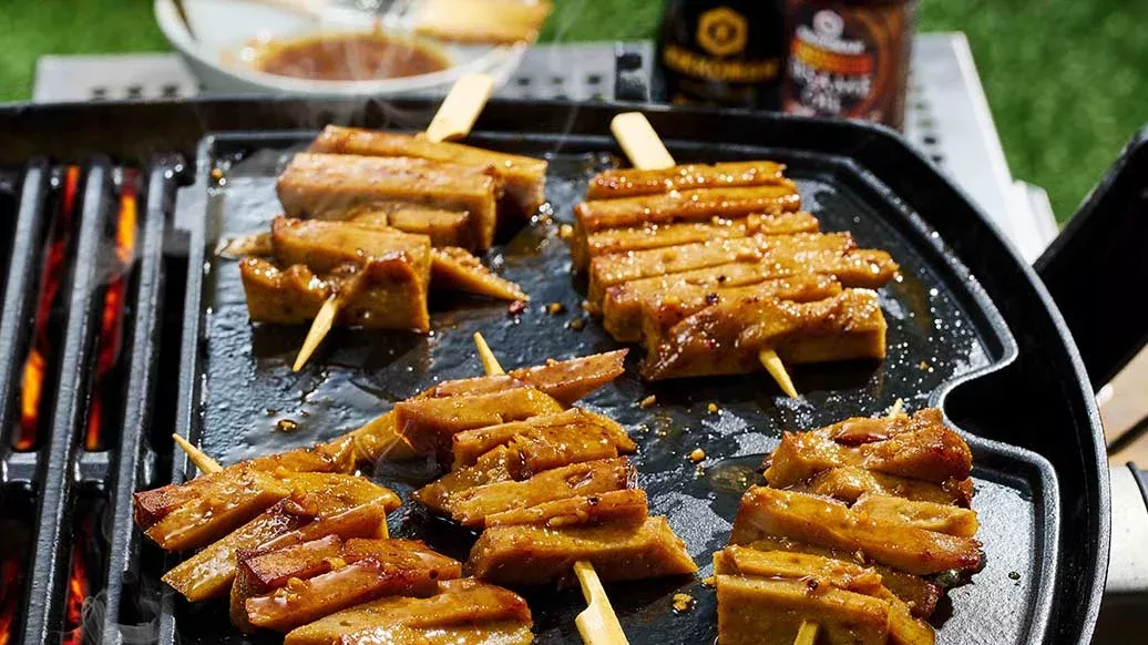 Пикантные шашлычки из сейтана, замаринованного в ароматном соевом соусе с добавлением кунжута и зиры, в сочетании с салатом из киноа и кунжутом — аппетитный фьюжн, который понравится как любителям вегетарианской кухни, так и тем, кто предпочитает классические блюда!