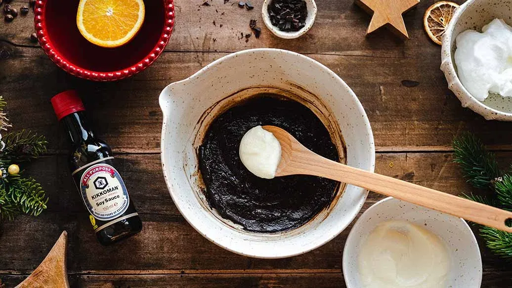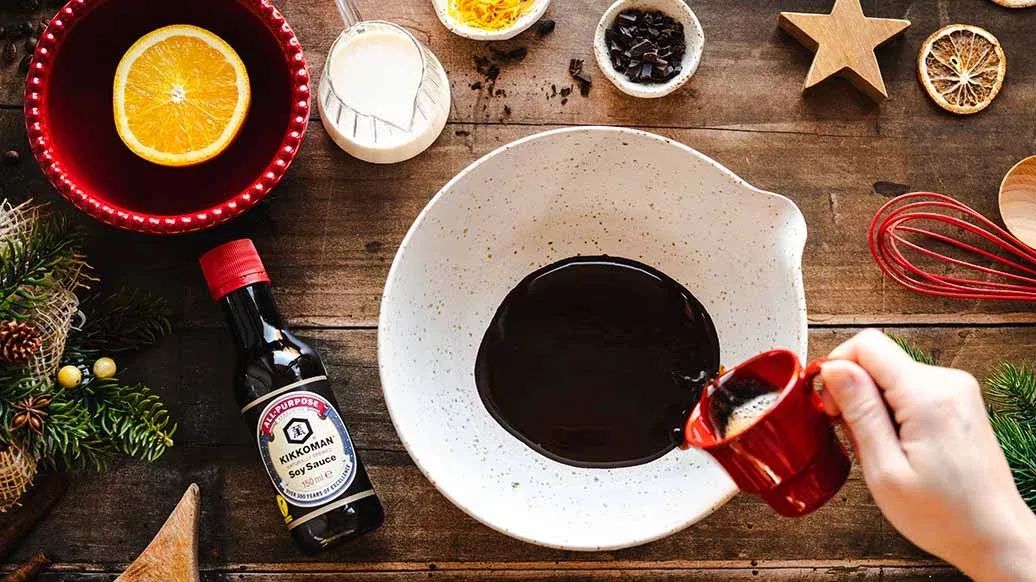 В средней миске смешайте растопленный шоколад, эспрессо и соевый соус Kikkoman. Перемешайте до однородной консистенции.