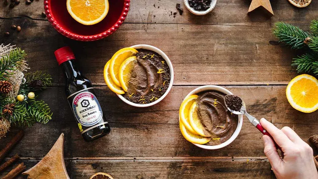 Воздушный мусс из тёмного шоколада и эспрессо с ноткой соевого соуса Kikkoman для тонкого, пикантного вкуса. Украшен цедрой апельсина, корицей и тёртым шоколадом для изысканного и элегантного завершения любого праздничного ужина.