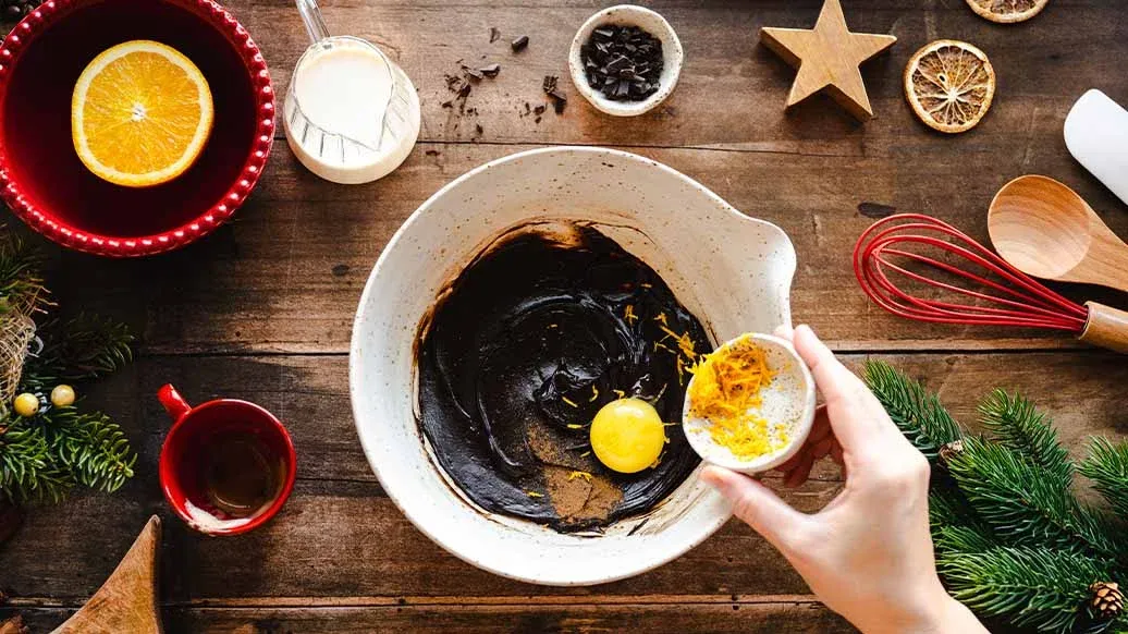 Добавьте яичный желток, корицу и цедру половины апельсина в шоколадную смесь. Перемешайте до однородной консистенции, затем отставьте в сторону.