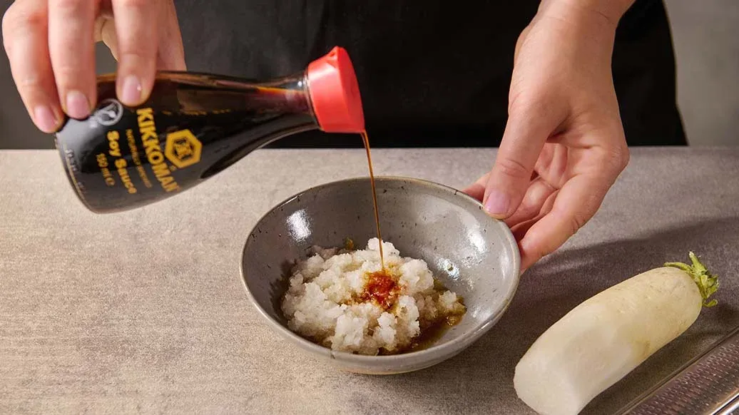 80 г соевого соуса натурального брожения Kikkoman – 20 г японской редьки дайкон – 1 ст. л. нарезанного зелёного лука