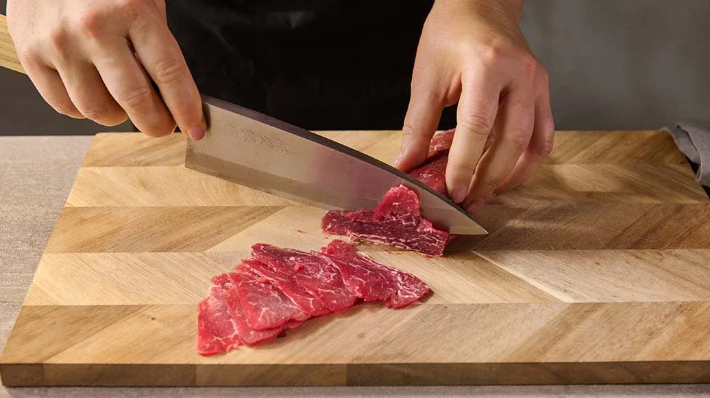 Поместите говядину в морозилку примерно на 40-50 минут. После охлаждения её будет легче нарезать тонкими слайсами.