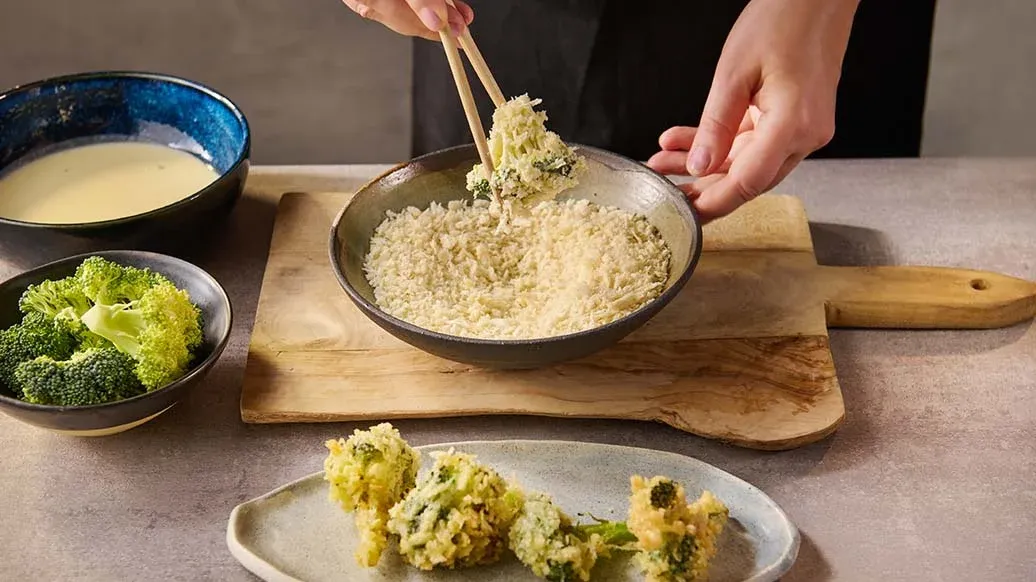 Брокколи при необходимости нарежьте на кусочки меньшего размера. Смешайте воду с мукой для темпуры и обмакните брокколи в кляр. Затем покройте панировочными сухарями Kikkoman и обжарьте в горячем масле в течение 3-5 минут до золотистого цвета.