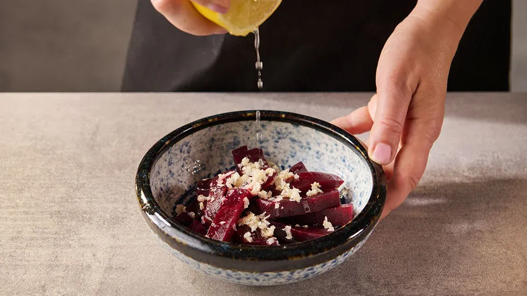 Нарежьте свеклу палочками, как картофель фри, и смешайте с кунжутным маслом Kikkoman, измельченным имбирем и лимонным соком.