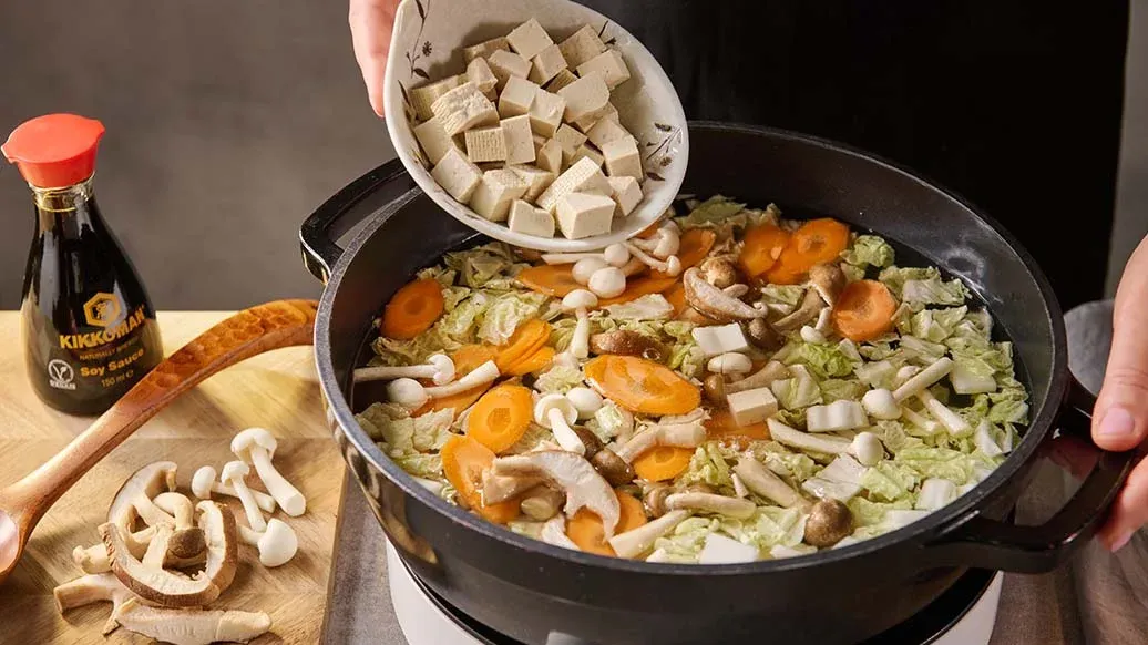 Приготовьте бульон даси, следуя инструкции на упаковке. Нарежьте морковь и капусту небольшими кусочками. Добавьте овощи и грибы в бульон и варите около 10 минут. Затем добавьте нарезанный кубиками тофу и соевый соус Kikkoman.
