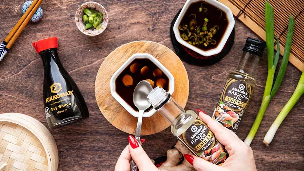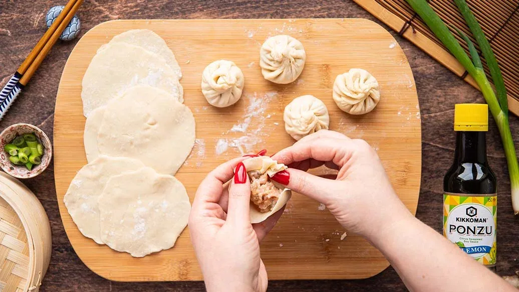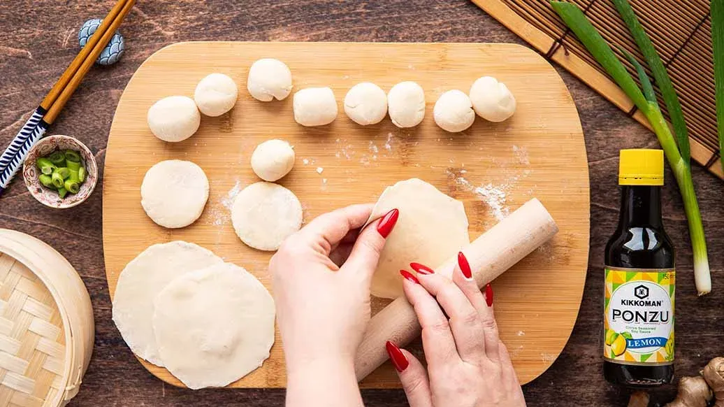 В одной миске смешайте соус Понзу Лимон, кунжутное масло Kikkoman, имбирь и зелёный лук. В другой миске смешайте соевый соус Kikkoman, приправу Kikkoman для суши и слайсы имбиря. Подавайте горячие пельмени с соусами-дипами.