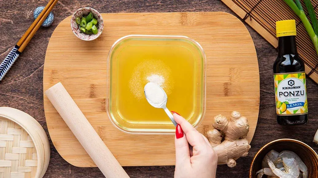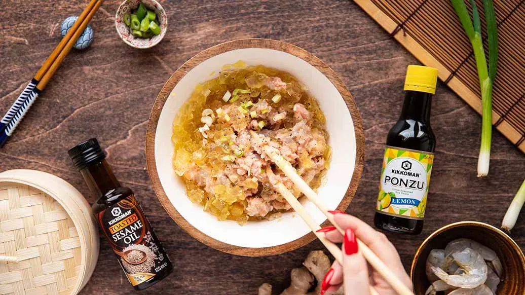 Смешайте в миске фарш, креветки, зелёный лук, имбирь, соус Понзу Лимон, кунжутное масло Kikkoman, сахар и перец. Когда бульон застынет, нарежьте его небольшими кубиками и аккуратно добавьте в начинку.