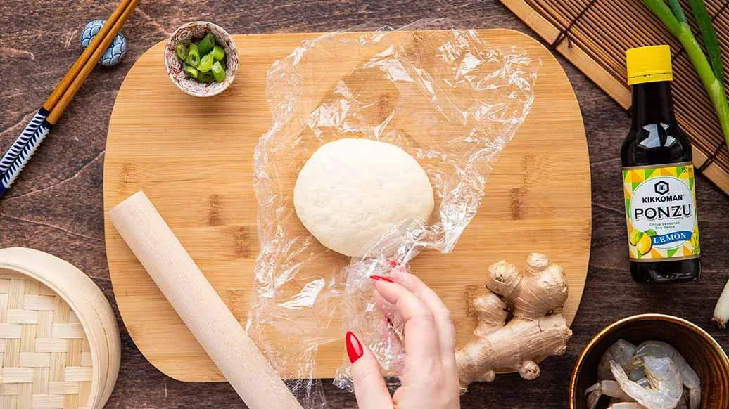 Смешайте муку и горячую воду в миске с помощью палочек или вилки до эластичного теста. Замесите до однородной консистенции, затем заверните в пищевую пленку и оставьте отдыхать, пока готовите остальные ингредиенты.