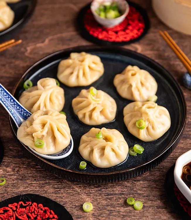 Сяо Лун Бао на пару — нежные китайские пельмени с начинкой из курицы, креветок и горячим бульоном. Подаются с двумя соусами-дипами на основе соевого соуса, придающими насыщенный вкус умами и пикантный вкус.