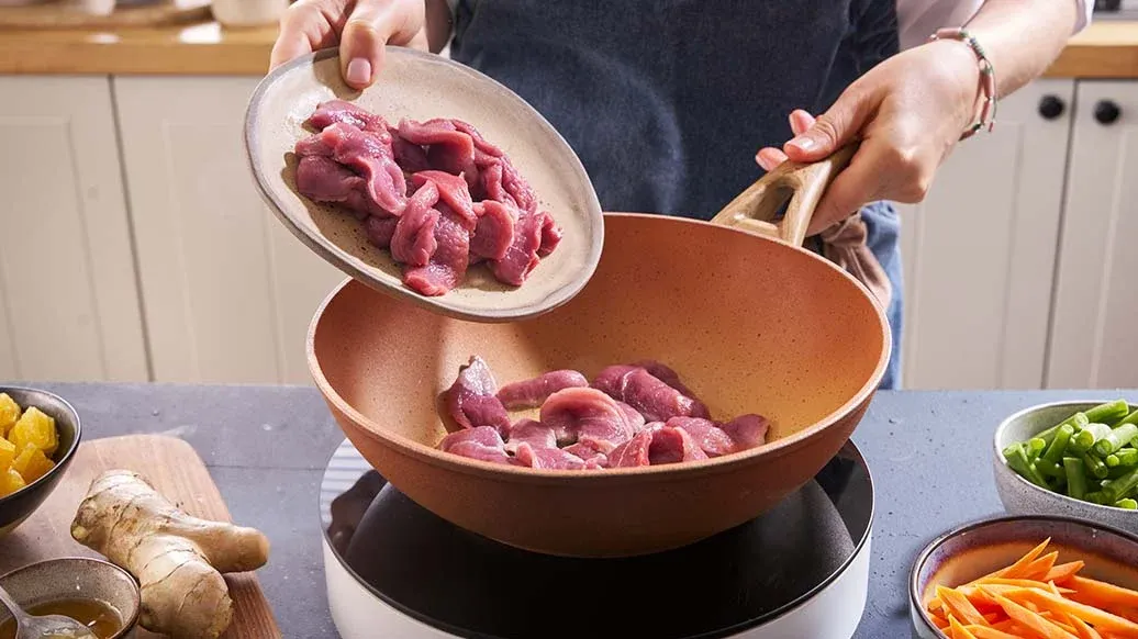 Обжарьте утку в раскалённом масле 2–3 минуты до легкого румянца, затем выньте из вока и отложите в сторону.