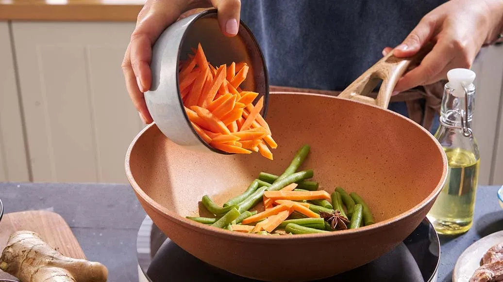 Нагрейте масло в том же воке, добавьте имбирь, морковь, зелёную фасоль и анис и обжаривайте 2–3 минуты. Добавьте воду и дайте ей выпариться в течение примерно 2 минут, пока фасоль не станет мягкой.