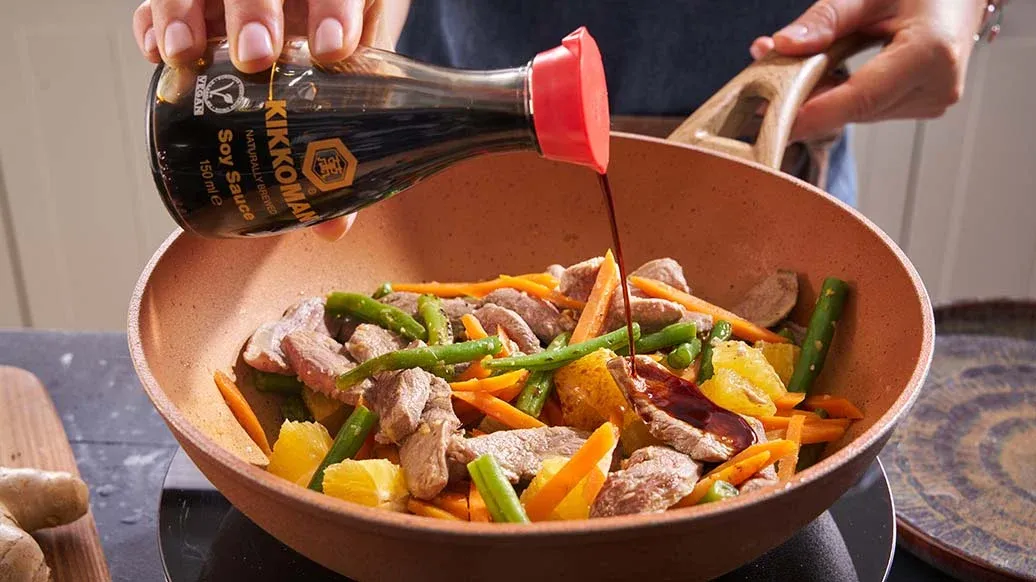 Ароматный стир-фрай в воке, где нежная утка сочетается с апельсином, свежим имбирём и соевым соусом Kikkoman — идеальный баланс сладких, солёных и ароматных вкусов в каждом кусочке.