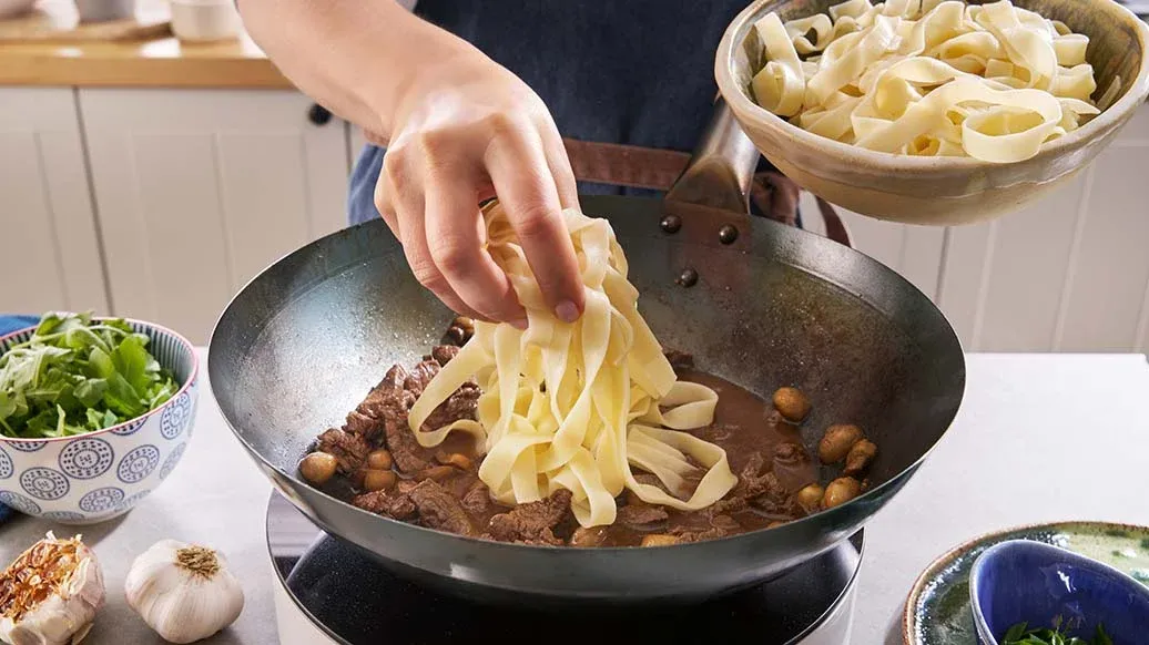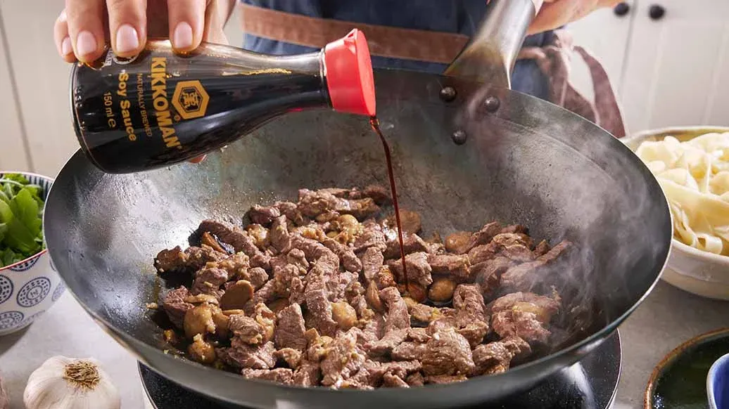Насыщенный и ароматный стир-фрай, в котором соевый соус Kikkoman подчёркивает вкус нежной говядины, жареного чеснока и шампиньонов, создавая идеальный баланс для тальятелле.