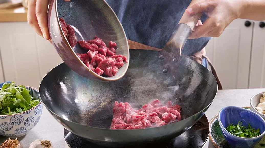 Разогрейте вок, добавьте масло и говядину и обжаривайте 2–3 минуты до появления румяной корочки. Выньте из вока и отложите в сторону.