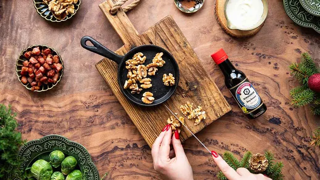 Нежная, согревающая смесь брюссельской капусты и картофеля с копчёным беконом и ноткой соевого соуса Kikkoman для особой глубины вкусв. Праздничное и элегантное начало трапезы с хрустящими грецкими орехами и нежным крем-фрешем.