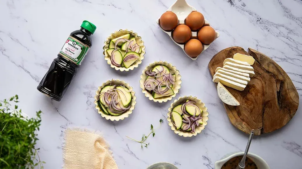 Тарталетки с камамбером, кабачками и красным луком приобретают насыщенный вкус благодаря соевому соусу Kikkoman. Их можно есть горячими или холодными, и очень удобно брать с собой.