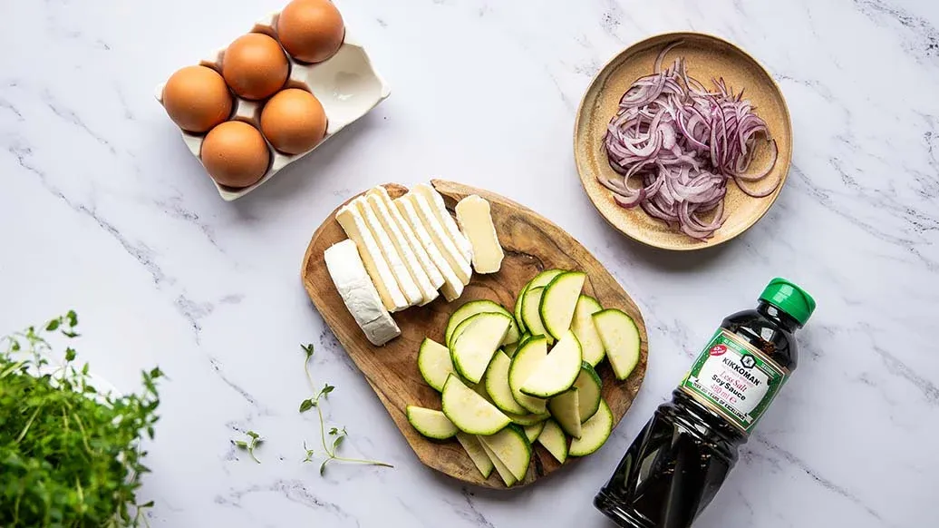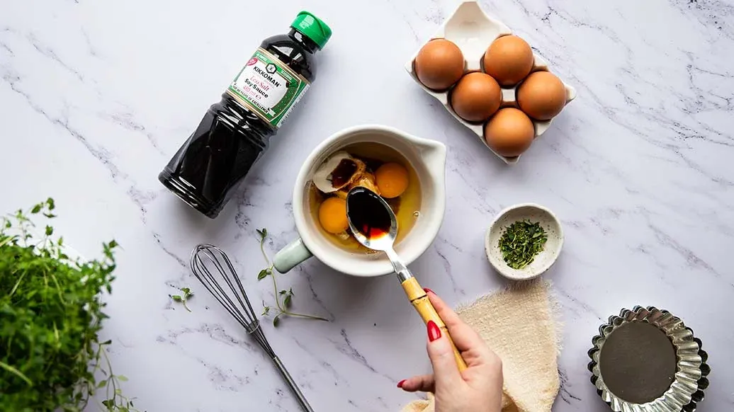 Взбейте яйца с греческим йогуртом, слабосоленым соевым соусом Kikkoman, шрирачей и тимьяном.