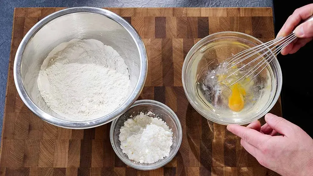 400 мл газированной минеральной воды – 1 яйцо – 200 г муки – 60 г кукурузного крахмала