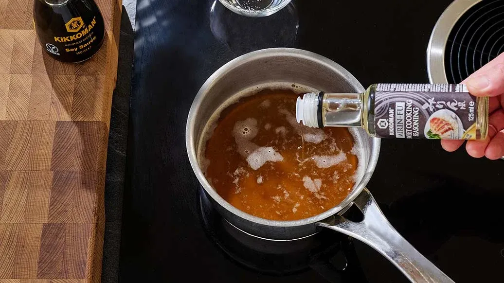 Смешайте в кастрюле овощной бульон, соевый соус Kikkoman, сладкую мирин приправу Kikkoman, сахар и нагрейте. Снимите с огня перед самым закипанием и отставьте в сторону. Очистите и мелко натрите дайкон и имбирь, затем хорошо процедите через сито.