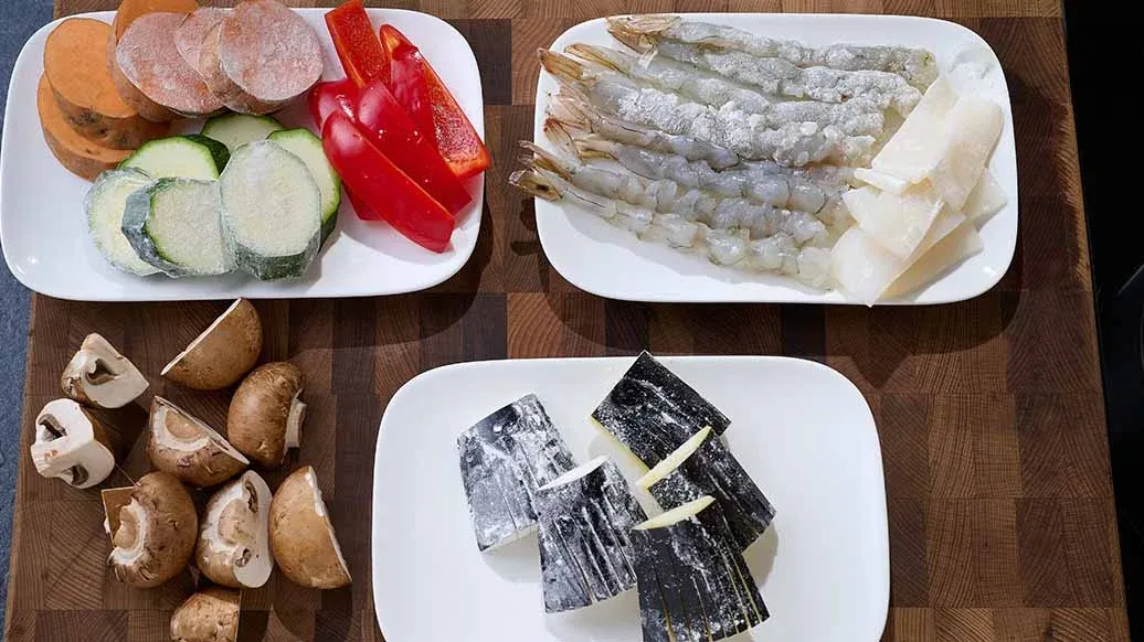 Если вы используете целое филе, нарежьте кальмаров на кусочки размером 2 x 4 см. Обмакните креветки бумажным полотенцем. Разрежьте грибы шиитаке пополам. Нарежьте болгарский перец на кусочки размером 2 x 4 см. Кабачок и батат нарежьте слайсами толщиной около 8 мм. Разрежьте баклажан вдоль на 4 части и срежьте кожицу по диагонали