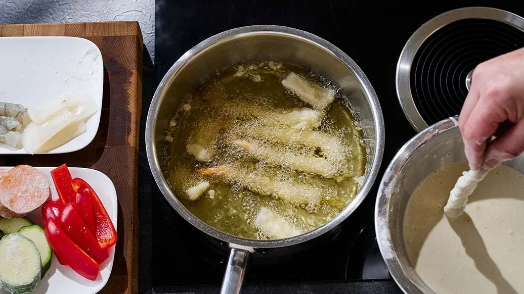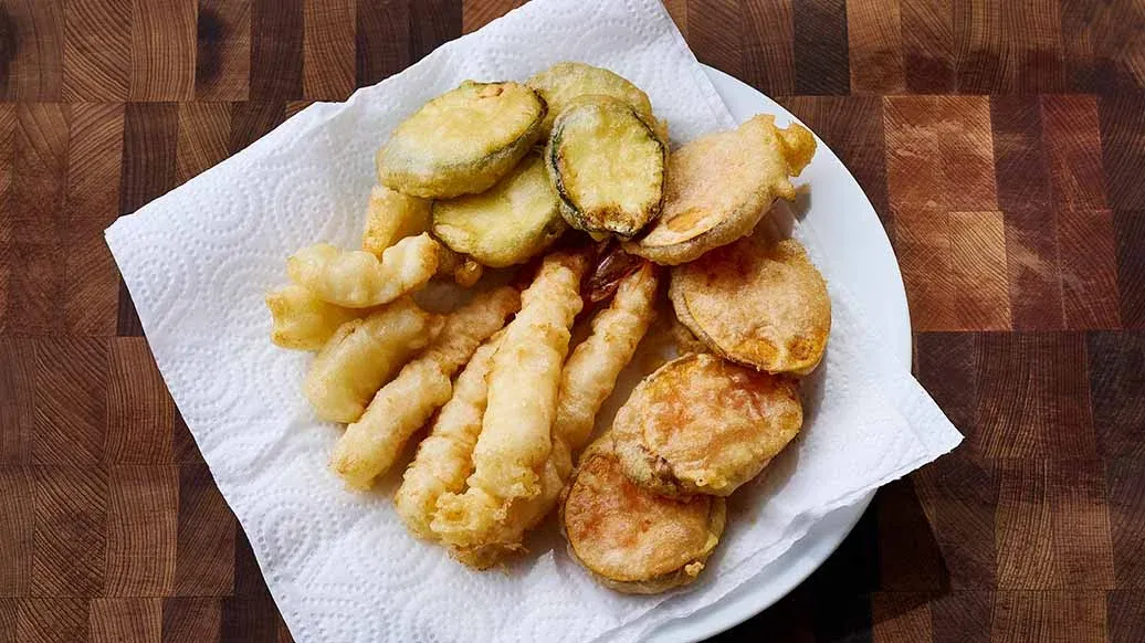 Посыпьте все ингредиенты мукой, стряхните излишки, обмакните в кляр из шага 2 и обжарьте в горячем масле при температуре около 170°C до золотистой корочки. Затем положите на бумажное полотенце, чтобы промокнуть лишнее масло.