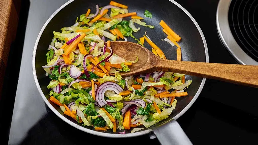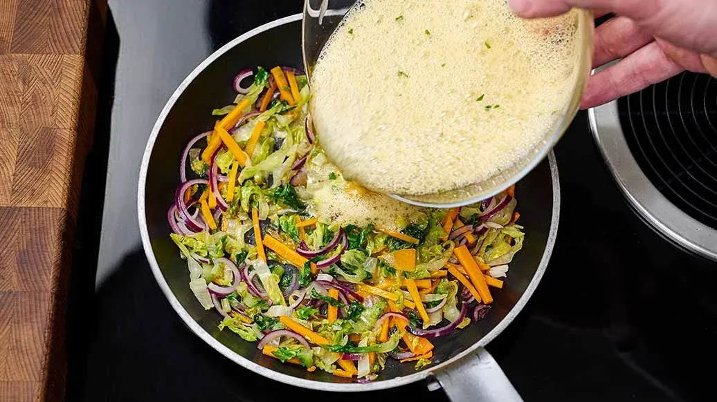 Нарежьте остроконечную капусту и морковь полосками. Очистите лук, нарежьте тонкими кольцами и обжарьте все в разогретом масле Kikkoman из поджаренного кунжута на небольшой сковороде в течение 5 минут.