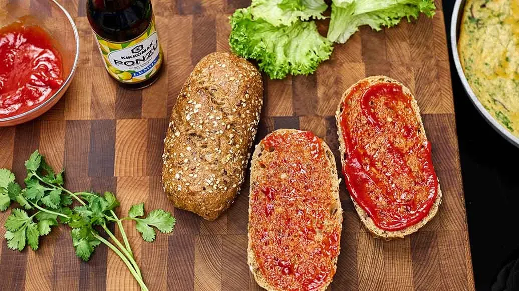 2 маленьких цельнозерновых багета для сэндвичей – 1 ст. л. сливочного масла с морской солью – 3 ст. л. кетчупа – 2 ч. л. цитрусово-соевого соуса Понзу Kikkoman «Лимон» – 1 ст. л. томатного пюре – 2 листа зелёного салата, например, лолло бионда – Несколько листьев кинзы