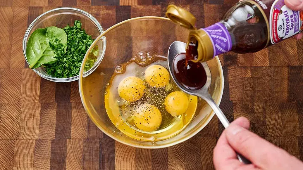 Вымойте шпинат и очень мелко нарежьте. Взбейте яйца с соусом Терияки Kikkoman с обжаренным чесноком, приправьте перцем и добавьте к шпинату.