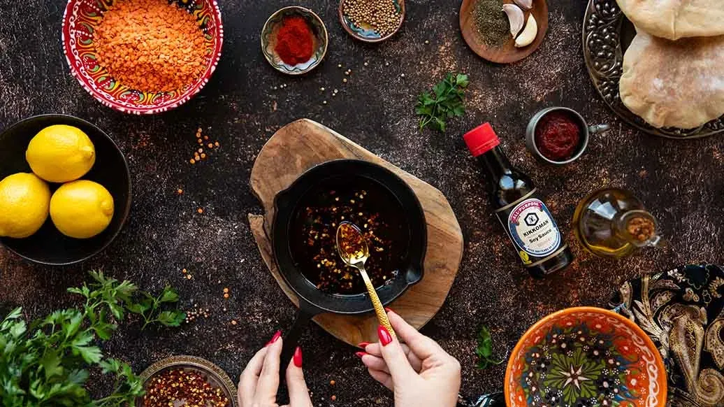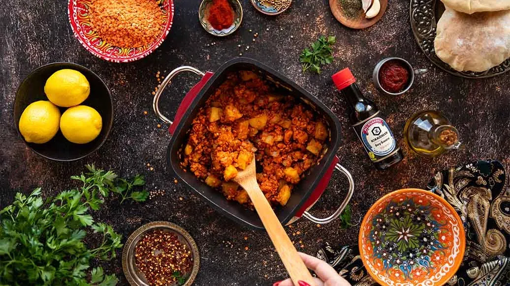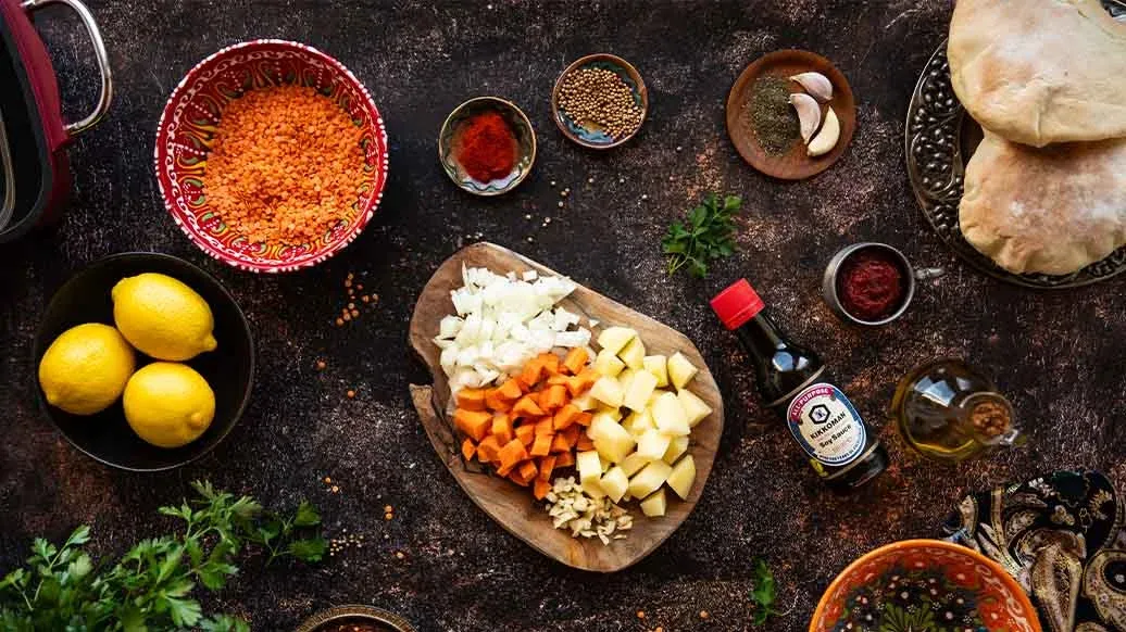 Согревающий суп из красной чечевицы, моркови, картофеля и чеснока, со специями и томатным пюре. Соевый соус Kikkoman придаёт супу насыщенный вкус умами, а мята, петрушка, перец чили и лимон делают его свежим и ярким.