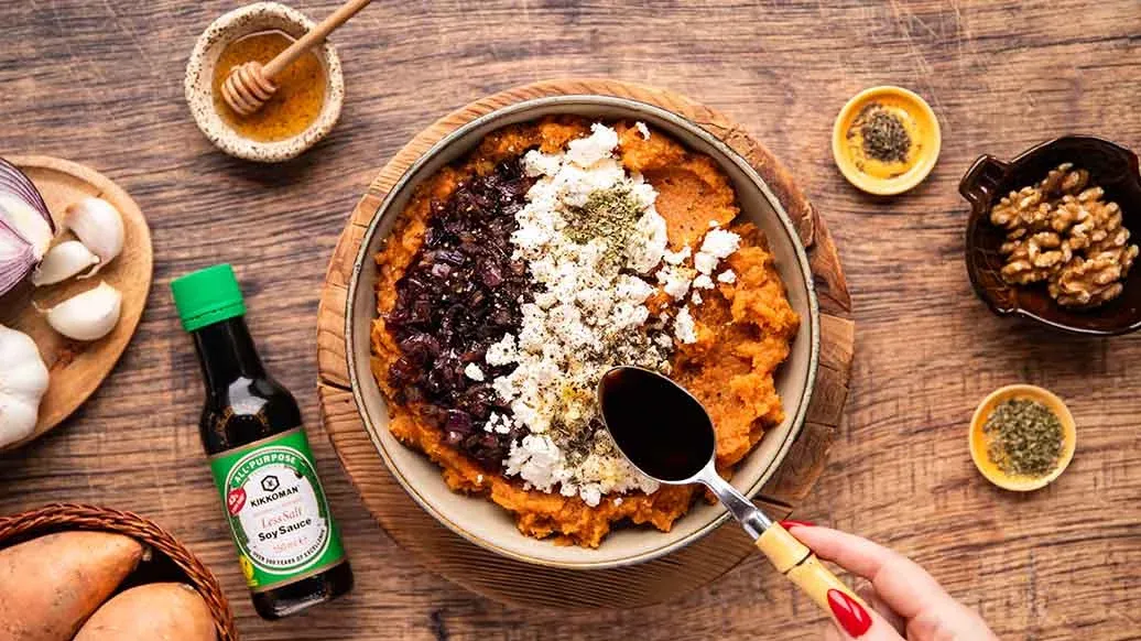 Нарежьте лук кубиками и обжарьте в разогретом масле до прозрачности. Добавьте мёд и 1½ ст. л. слабосоленого соевого соуса и готовьте, пока лук не карамелизуется. Добавьте половину смеси к батату, затем добавьте фету, чеснок, перец, майоран, тимьян и оставшиеся 1½ ст. л. слабосоленого соевого соуса Kikkoman. Хорошо перемешайте.