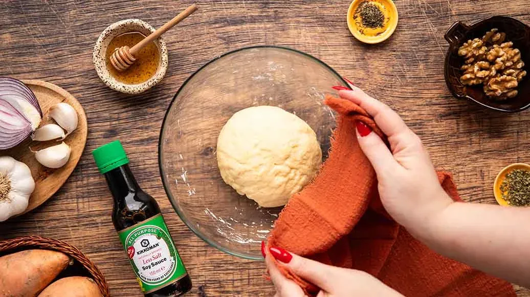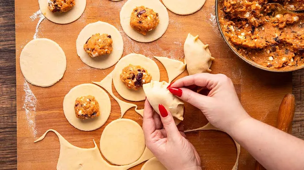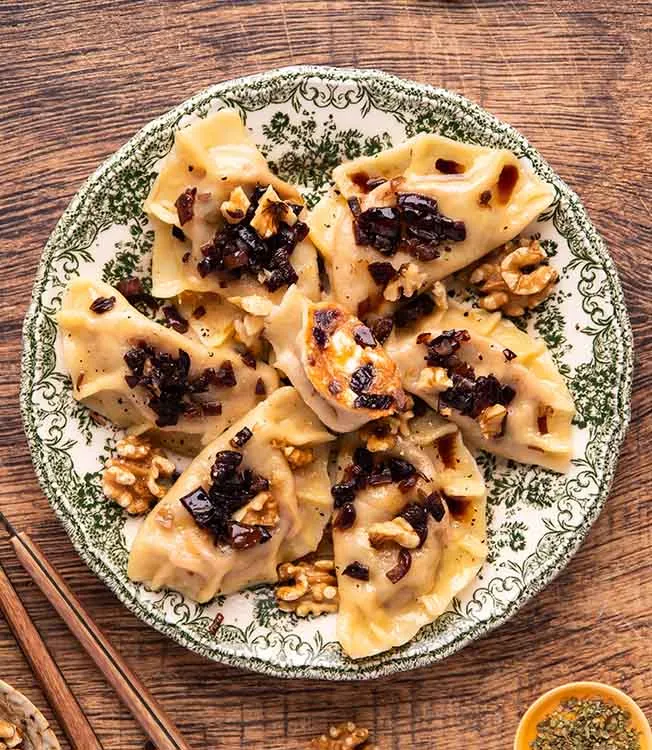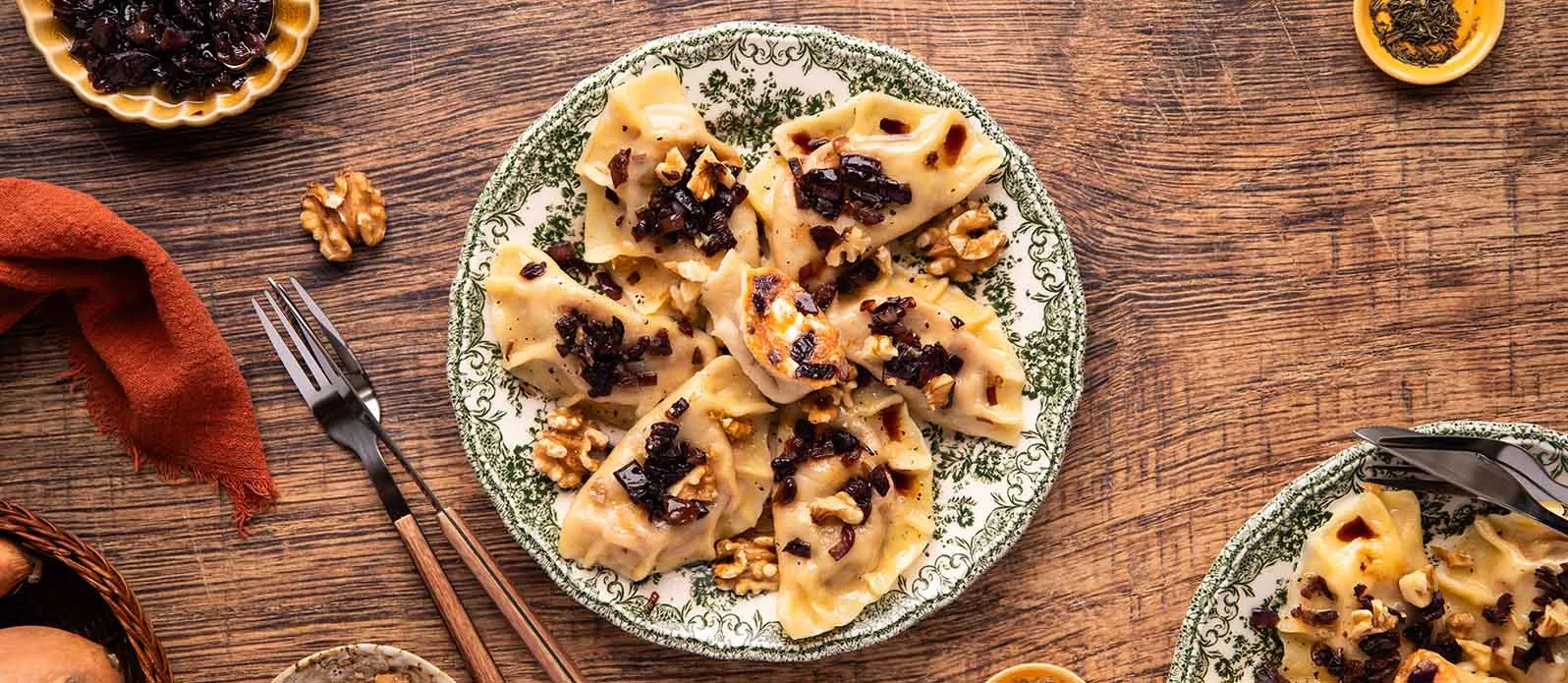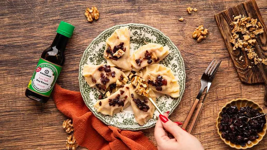 Пероги с изюминкой — польские пельмени с начинкой из батата, феты и карамелизированного лука. Немного слабосоленого соевого соуса Kikkoman добавляет глубину вкуса умами, а измельчённые грецкие орехи придают нежный хруст, создавая сладко-солёное удовольствие.
