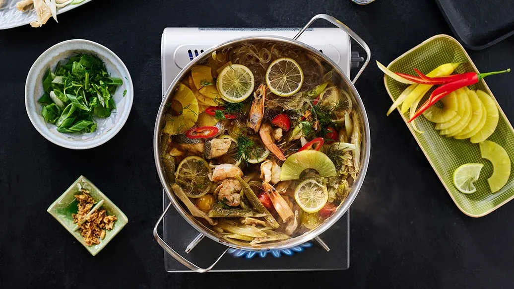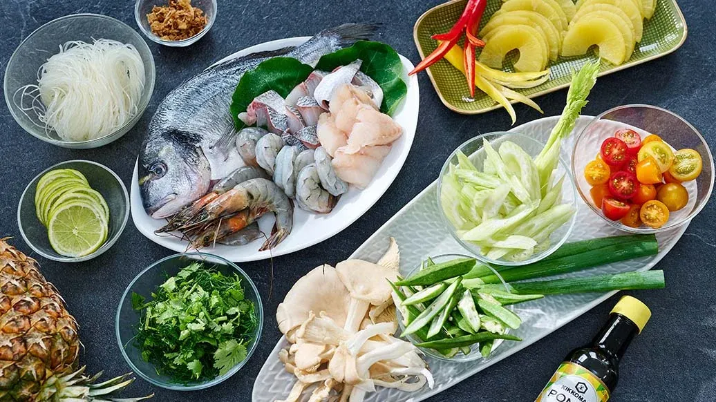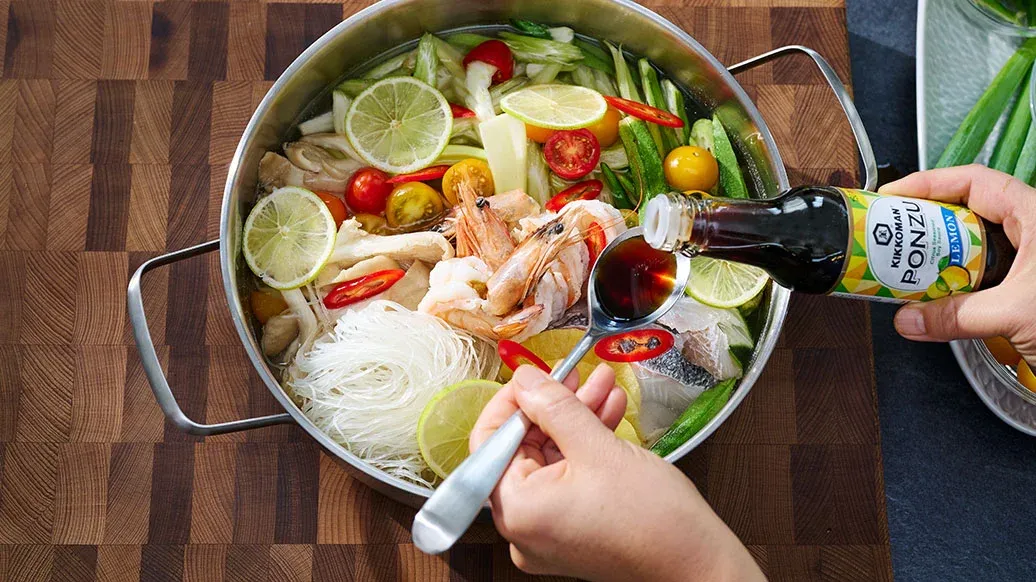 Сладко-кислый рыбный бульон с травами, морепродуктами, овощами, ананасом и томатами, вдохновлённый классическим супом кан чуа. С добавлением соуса Понзу Kikkoman Лимон это лёгкое и ароматное блюдо — идеальный выбор для большой компании.