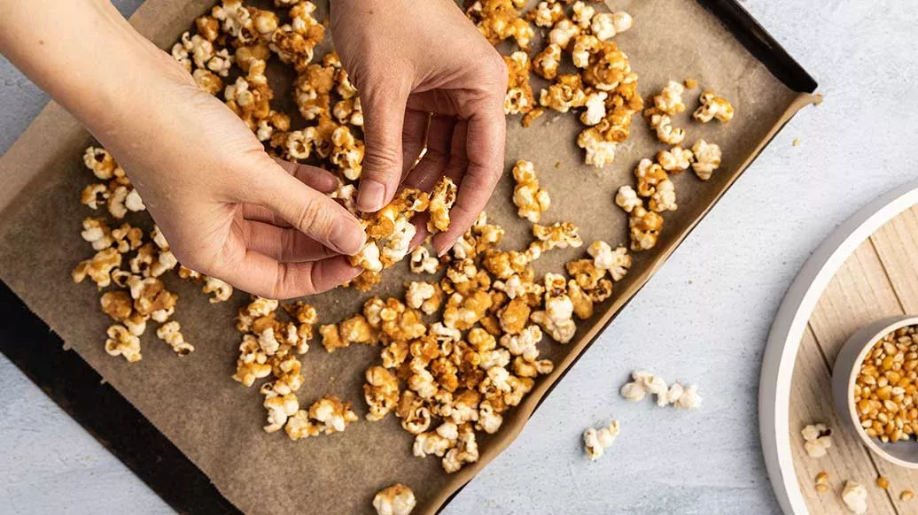 Выложите карамельный попкорн на большой противень, застеленный жиронепроницаемой бумагой. Подождите, пока он затвердеет, затем разломайте его на кусочки и верните обратно в миску.