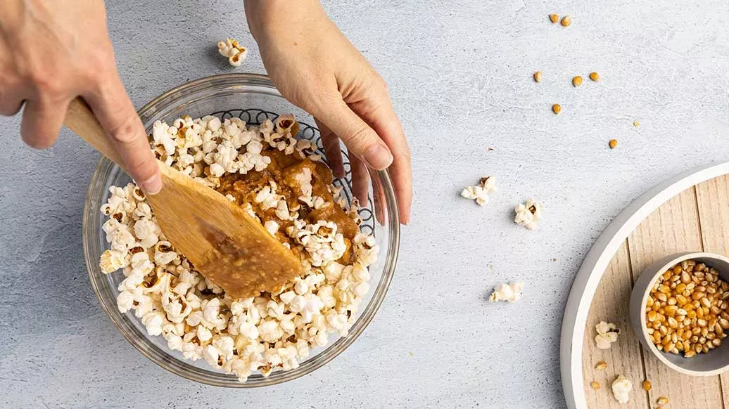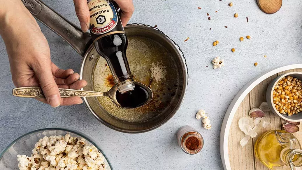 Чтобы приготовить карамель, поместите сахар и воду в сотейник и нагрейте их до полного растворения, не перемешивая. Слегка вращайте сотейник, чтобы сахар равномерно распределился. Когда сахар станет золотистым, добавьте масло и соевый соус Kikkoman. Перемешайте и перелейте в другую миску с попкорном.